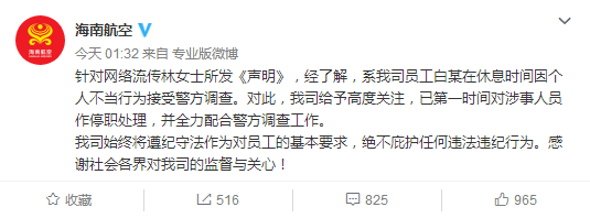 7月24日凌晨,海南航空官方微博证实了白某的行为,并表示“已第一时间对涉事人员作停职处理,并全力配合警方调查工作”。