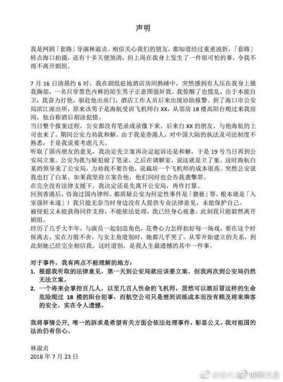 原标题:“飞机师”性侵女导演,培养成本高不是免追罪责理由文|沈彬近日,一部网剧的导演林淑贞发声明称:7月16日清晨,自己在海口某酒店的房间床上睡觉,突然一个只穿着内裤的男子爬上