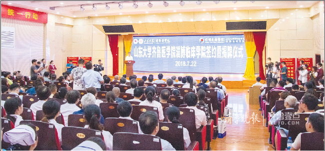 7月22日上午,山东大学齐鲁医学院淄博临床学院签约暨揭牌仪式在世博高新医院举行。临床学院的成立,是世博高新医院建院至今的一件大事,是山东大学医学教育改革和发展值得纪念的一件大事,也是淄博市医疗健康事业转换提升的一件大事。同时,淄博临床学院的成立,也标志着山东大学齐鲁医学院和世博高新医院的合作进入了一个新的发展阶段。