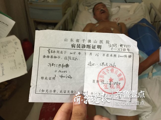 在长清人民医院治疗了一个多小时后,董金水被紧急送往了山东省千佛山医院。据董文圣介绍,送到急诊时,他父亲抽搐、口吐白沫、意识昏迷、大便失禁,体温有42度,被诊断为热射病。医生进行降温后,很快将其送到重症监护室。据急诊内科的袁医生介绍,当时董金水的肝肺已经衰竭,呼吸也衰竭,需要上呼吸机。