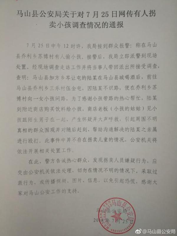 在此,警方告诫热心群众,发现拐卖人员嫌疑行为,应交由公安机关依法处理,切勿在情况不明的情况下,采取过激行为,或传播视频、图片、信息,以免引起恐慌,感谢大家对马山公安工作的支持。(本文原题为《男子买饮料感谢女孩指路 村民误以为拐卖儿童进行殴打》)