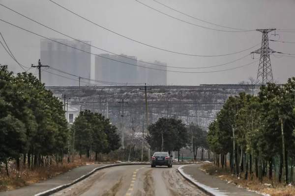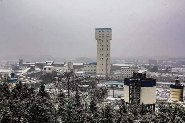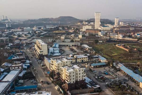 除了铜绿山、龙角山,位于大冶市西南的铜山口也是一个因矿而兴的地区。当地因蚌壳山和狮子山之口均有铜矿而得名。据铜山口矿老职工介绍,1958年铜山口矿建矿于此,次年铜山口镇成立。图为2018年1月,铜山口周边地区景象,画面右上角高耸的楼状建筑,即是铜山口矿矿井。