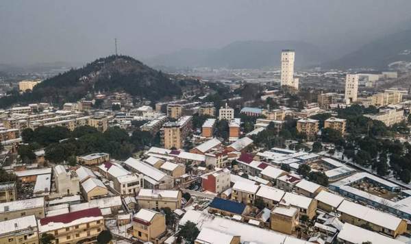 2018年1月,龙角山村及周边俯瞰图。龙角山是大冶另一个因矿而兴的地区。1953年,中南地区首个铜矿——新冶铜矿在此成立。1956年当地建镇,并于1980年划归大冶县,更名为龙角山镇,被誉为“黄石地区小香港”。曾经大冶看不到的电影,在此能先看到。后因资源枯竭,新冶铜矿停产,龙角山镇也被撤为龙角山村。
