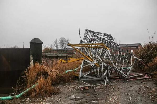 2018年1月,大冶泉塘村内,一座在铜绿山矿尾矿库溃坝中被冲倒的电线塔。