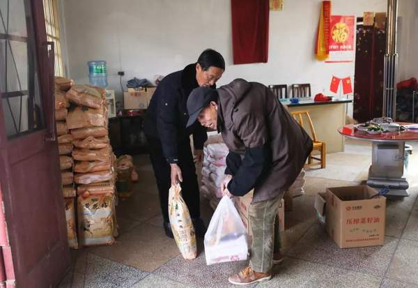 原新冶铜矿调度长石志珍(左)仍居龙角山。2018年春节前,他在家向住在大冶及龙角山周边的原新冶铜矿退休职工发放米、油、挂面等物资。这些物资是由原新冶铜矿的上级部门大冶有色公司拨付的。据他介绍,目前当地共有82位原新冶铜矿退休职工。