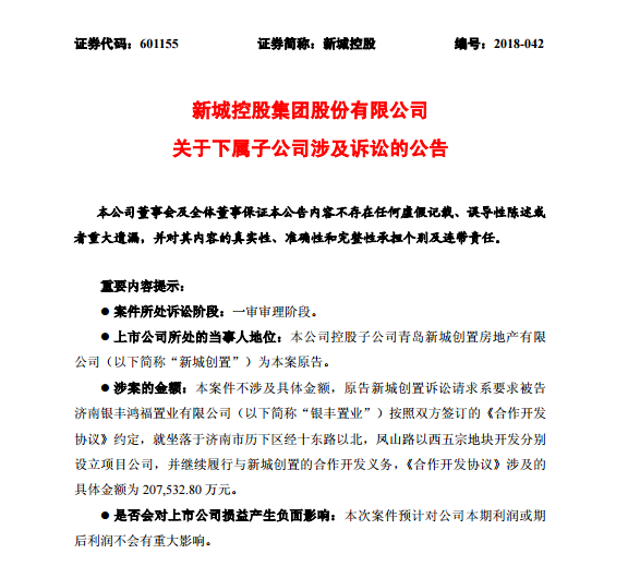 原标题:新城披露起诉济南银丰置业进展:合作地块被判查封3年