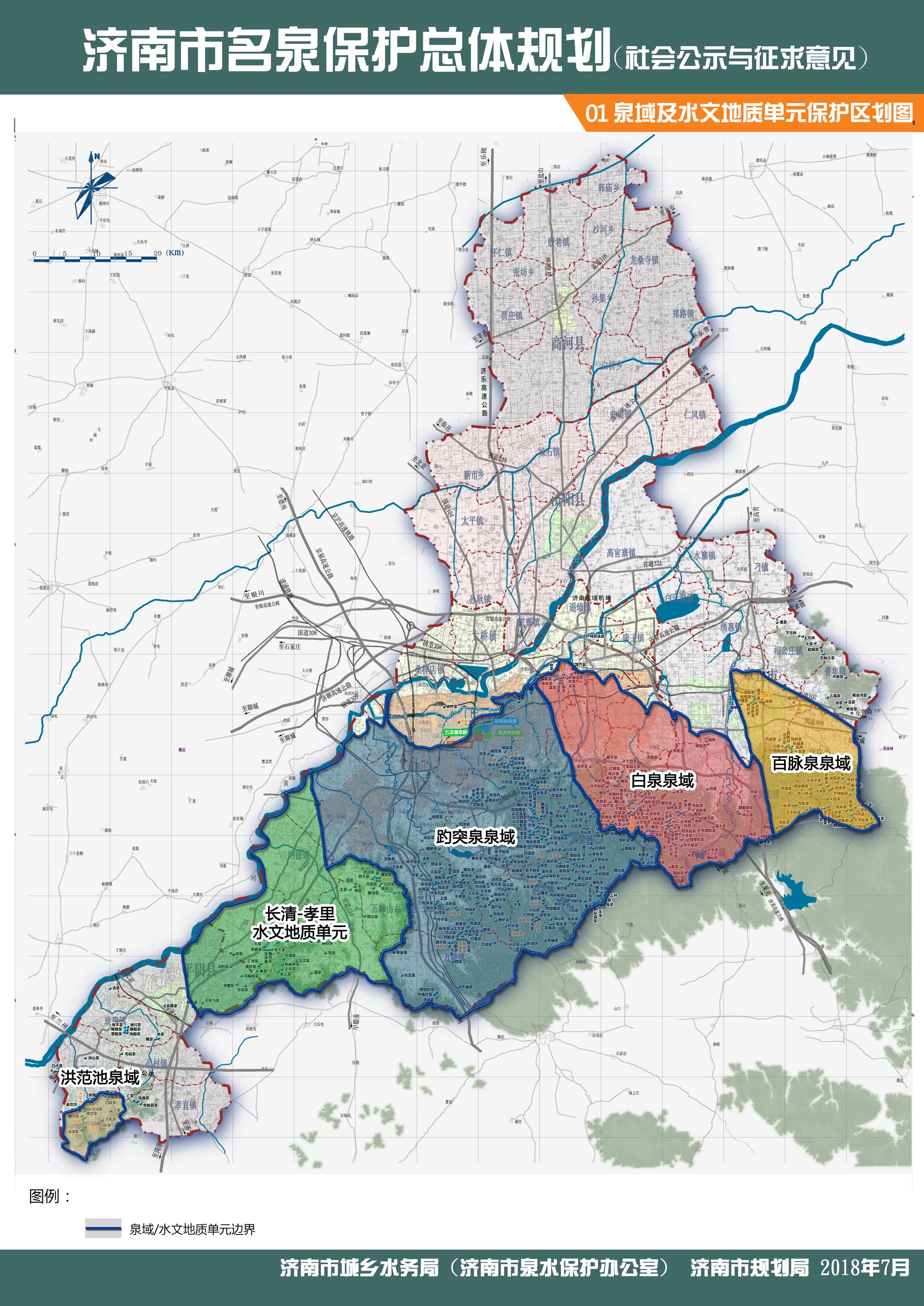 该规划将指导名泉保护工作,是编制各泉群保护详细规划、开展规划范围内泉水生态和人文景观的保护,管控各项建设活动的主要依据。规划分为总体保护和重点泉域控制两个层次,总体保护规划范围为洪范池泉域、趵突泉泉域、白泉泉域、百脉泉泉域及长清-孝里水文地质单元,总面积约 3542.8 平方公里。重点泉域控制规划范围为趵突泉泉域和白泉泉域,总面积约2392.4平方公里。