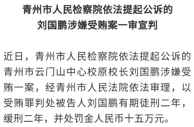 原标题:重磅!青州一校长被判有期徒刑!罚款15万! 来源:山东省人民检察院、大众网 如果本条内容侵害