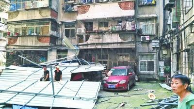 武汉晚报讯(记者陈奇雄)一个面积约160平方米、用铁皮做成的防雨隔热棚,被一阵大风刮得从8楼房顶坠落到地面,将停在楼下的4辆私家车砸中。7月29日晚,上述惊险一幕发生在东西湖区吴家山街吴北路一小区。幸运的是,事故未造成人员伤亡。昨日,记者现场了解到,铁皮棚是顶楼3户业主私自请人搭盖的,被城管执法人员认定为违法建筑。