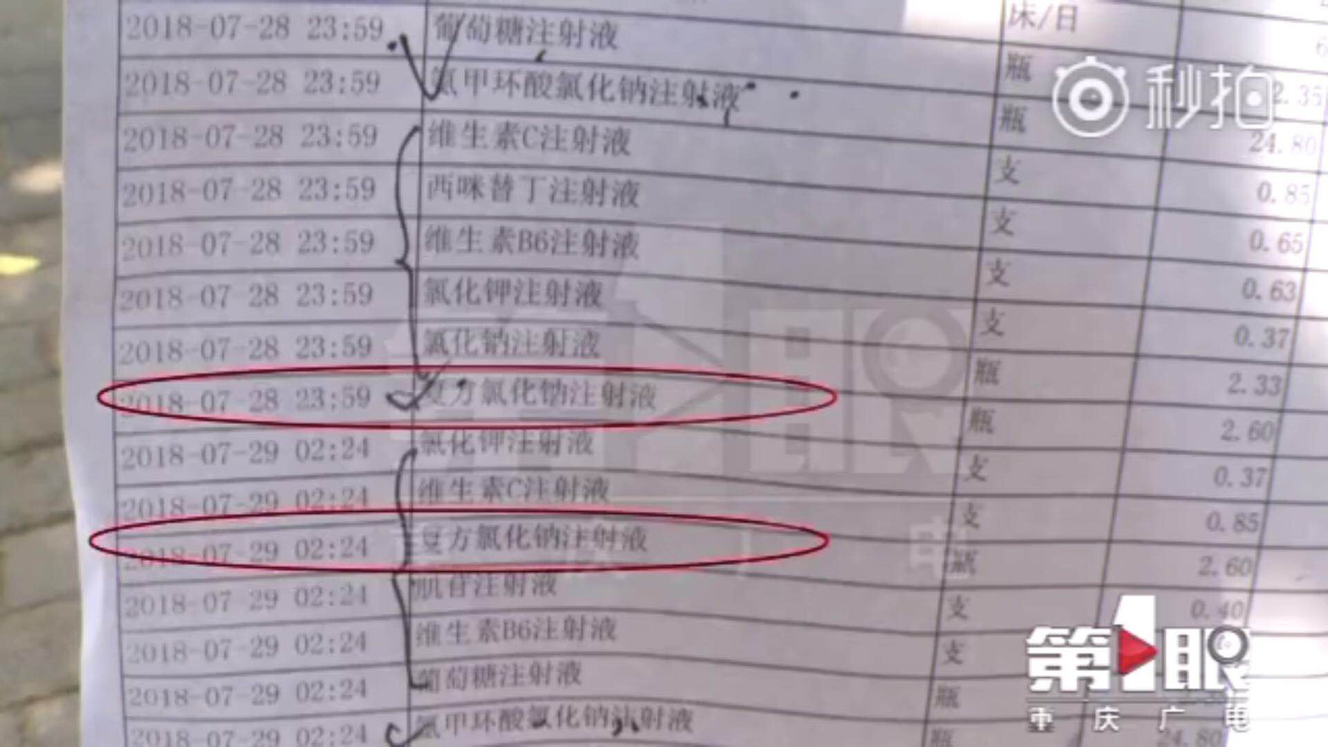 据重庆广播电视集团第1眼报道,7月28日下午,杨朝成出现咳血症状,家人将其送至合川区沙鱼镇卫生院治疗,并分别于28日23时59分及29日2时24分两次使用该卫生院的复方氯化钠注射液。第二次输液约10分钟后,杨朝成口吐鲜血,家人将还没拔掉针头的杨朝成连夜送至合川区中西医结合医院。该医院一名护士很快发现,病人的注射液有效期至2018年5月,已过期两个月。