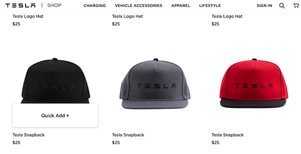其中,特斯拉帽子售价25美元一顶,有鸭舌帽也有毛线帽;男士和女士皮手套均售价100美元;儿童可以驾驶的Model S玩具车售价600美元,车速可达到3至6英里/时。