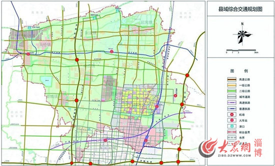 县域综合交通规划方面,强化东西走廊,拓展南北走廊。借力济青高铁与济青高速,强化桓台在山东省东西向主通道上的交通区位优势。建设沾(化)临(沂)高速,预留临沂经淄博至滨州的快速铁路通道,提升桓台南北向对外交通通达能力。构建综合体系,实现便捷集散。借力小清河复航工程,建设淄博港,打造淄博水运物流枢纽。建设桓台通用机场。构建全县“公铁水空”多元综合运输体系,优化重大交通设施集散系统,增强全县辐射和带动能力。融入张店,同城发展。通过城市轨道交通、快速路等交通设施,打造同城化交通联系,促进桓台融入淄博市中心城区发展。