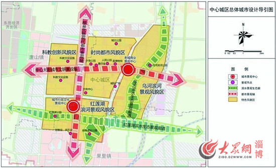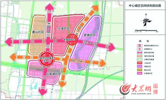 中心城区空间结构为“两心四轴、六带四区”。两心,一主一副两个城市中心,即在红莲湖以北、柳泉北路和桓台大道交汇处构建城市综合服务主中心;依托少海街道和索镇街道形成老城副中心。四轴,依托柳泉北路和中心大街构建两条城市功能主轴,依托张北路和桓台大道构建两条城市功能次轴。六带,依托南北向的唐华路、柳泉路、张北-兴桓路和乌河,东西向的中心大街和红莲湖,形成六条生态廊道,整体形成“碧水贯城、绿环营城、佳园缀城”的齐韵水乡生态格局。四区,少海、索镇、唐山和红莲湖四个城市综合功能片区。