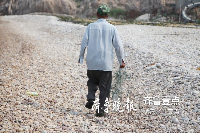 “那个穿着长袖,戴着迷彩帽子的,就是‘一把手’。”在渔民指引下,记者看到,晒得黝黑的孙家胜正在球石滩上巡逻,右手里拿着网兜,兜里装着几个矿泉水瓶。