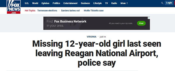 美警方发安全警报:一12岁中国女孩疑在美国机场被绑架