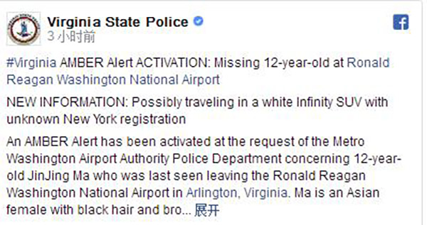 警方说,12岁的马金晶黑发,身高约1米5、体重约80斤,失踪前身穿白色T恤、蓝色牛仔裤和白色外套,最后一次露面时正离开华盛顿里根机场。