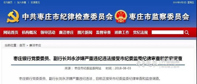 原标题:枣庄银行副行长刘永涉嫌严重违纪违法被调查