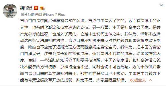 @胡锡进:言论自由是中国治理摩擦最多的领域。言论自由是入了宪的,因而有法律上的正义性,也有时代潮流和技术进步的支持。另一方面,中国是社会主义国家,是共产党领导的国家,也是入了宪的,它是中国现代国体之本