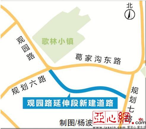 往后市民可以经观园路从规划六路直达规划七路。而规划七路北侧与葛家沟东路相连接,再向东可与东绕城相连。观园路延伸段新建道路工程通车后,将完善观园路片区与东绕城之间的路网骨架。