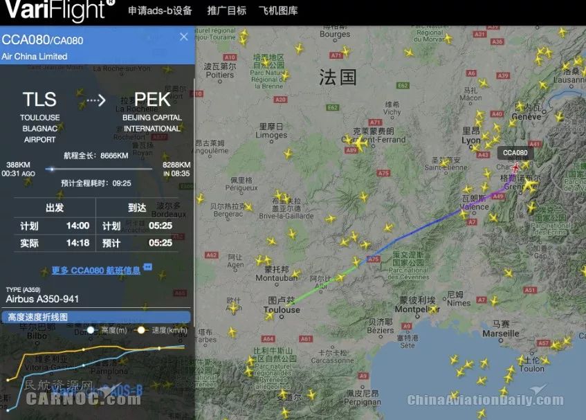 据飞常准消息,国航A350飞机已于北京时间20:18从法国图卢兹起飞回国,预计将于北京时间8月9日早上5:30左右抵达北京。