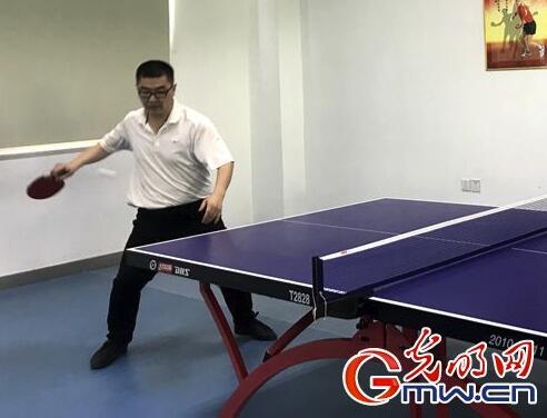 造血干细胞捐献者任抗战正在和同事乒乓球比赛(李政葳/摄)