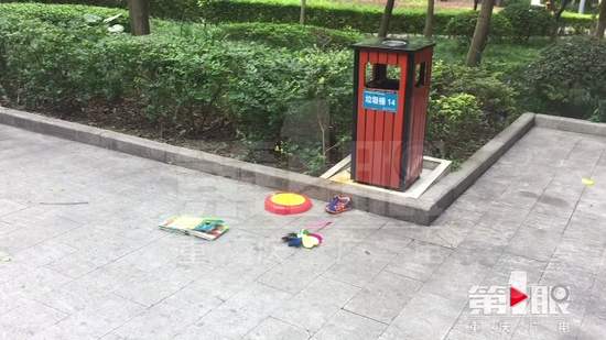 掉下来的东西重重地砸在居民过往的通道上,有的掉进了旁边的绿化带里。主要是儿童玩具、书画和儿童鞋子。目击者介绍,这些东西是从16楼掉下来的。