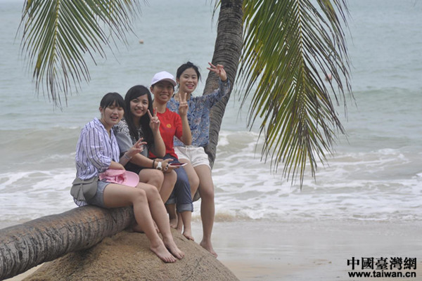 台湾营员在三亚鹿回头公园山顶把美丽的三亚湾摄入镜头。(图片来源:海南台办)