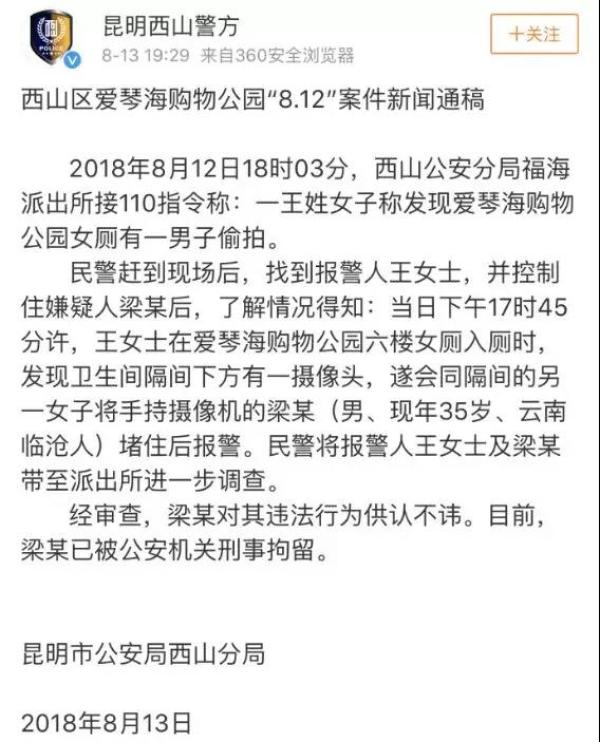 13日19时许,西山警方发布通告:涉事男子梁某对其违法行为供认不讳,目前已被公安机关依法刑拘!