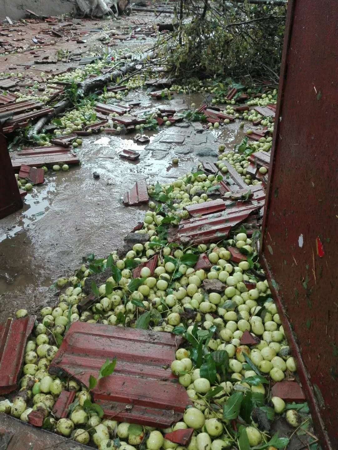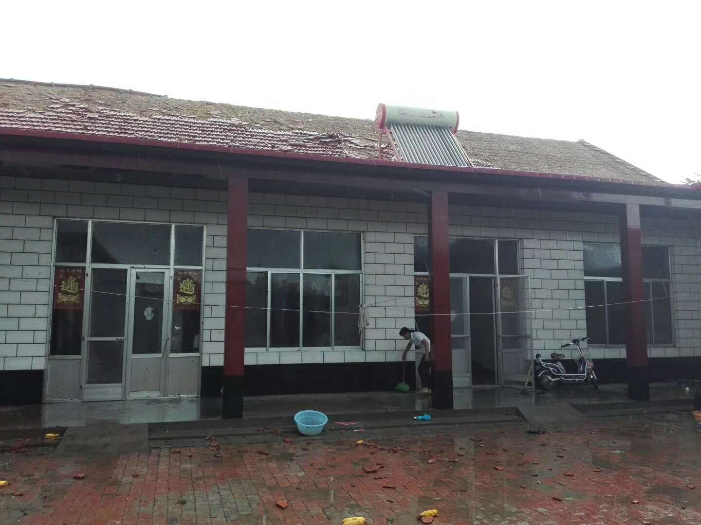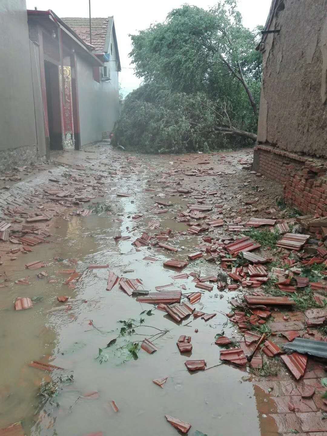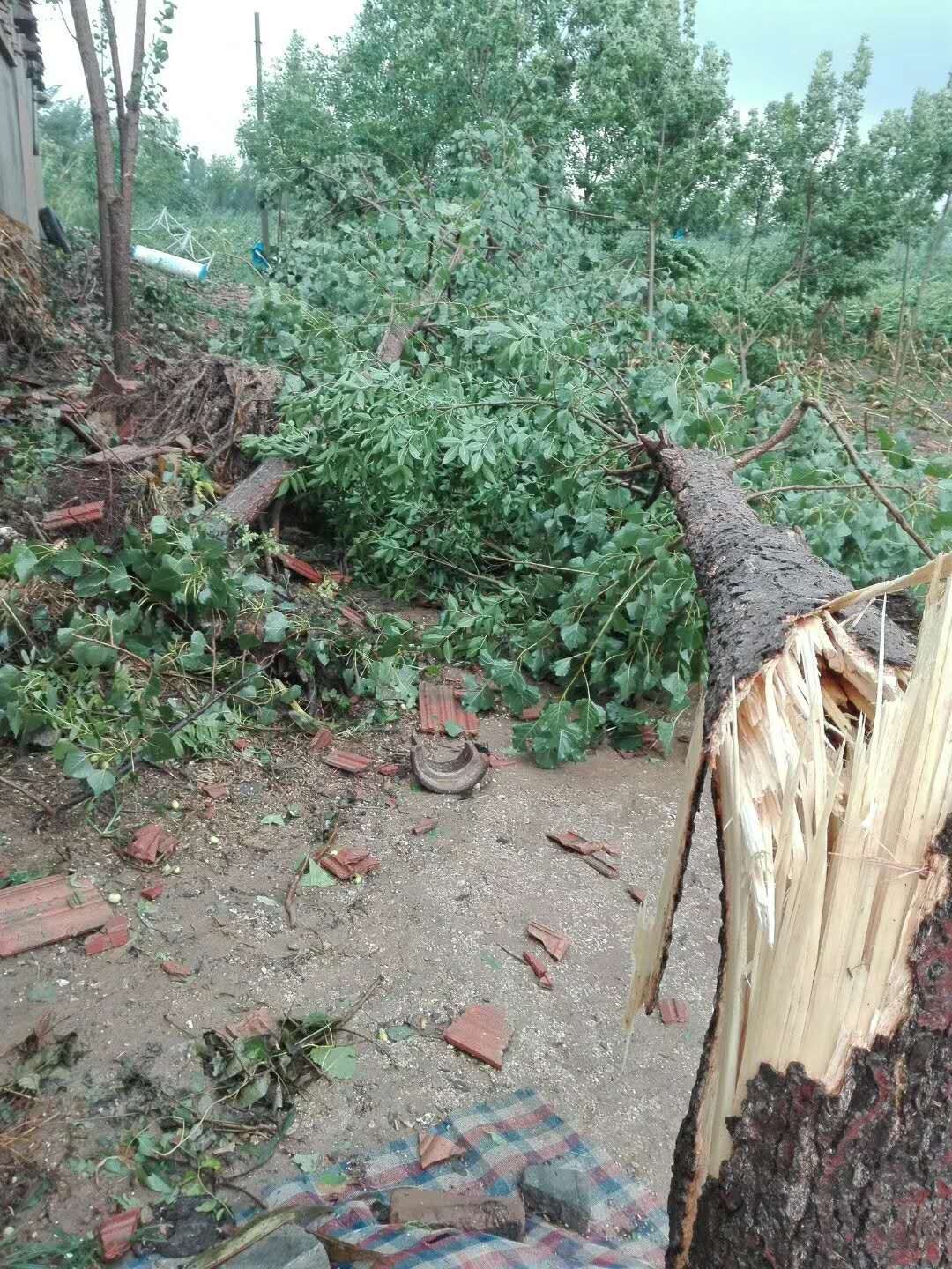 她说,大风持续了四五分钟,到院子里看,地上满是破碎的瓦片,屋顶过半瓦片被掀掉,邻居家的大树被吹断后落到自家院里,车玻璃都被砸烂了。有的村民脸和脚被刮碎的玻璃划伤。随后,村委会通知大家把受灾现场拍下来以备事后救灾用。