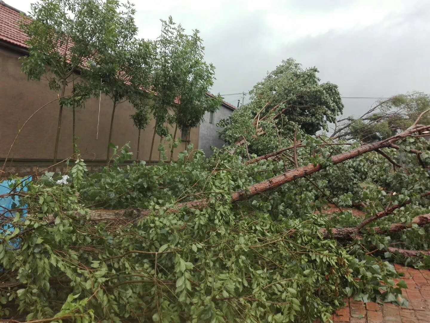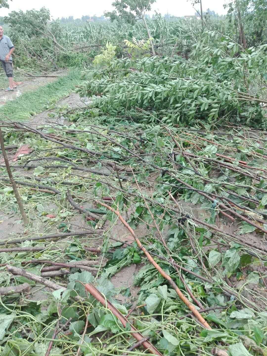 受灾较严重的马家村村民发布的受灾视频和照片显示,村庄内不少树木被吹倒,其中有直径十多厘米的树木从腰部吹断,有的民房超过一半的瓦片被吹落到地上,生长期的玉米大片倒伏。