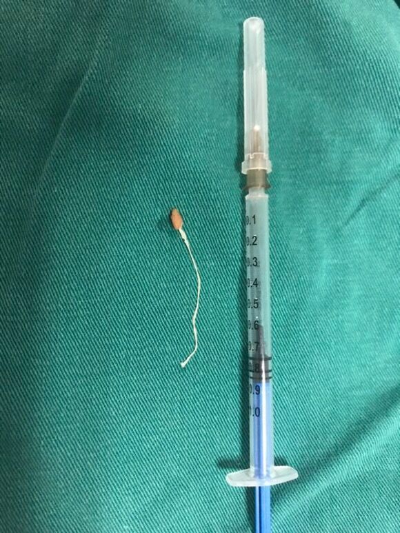 肩部包块“跑”到脖子 医生为他取出一条8厘米寄生虫