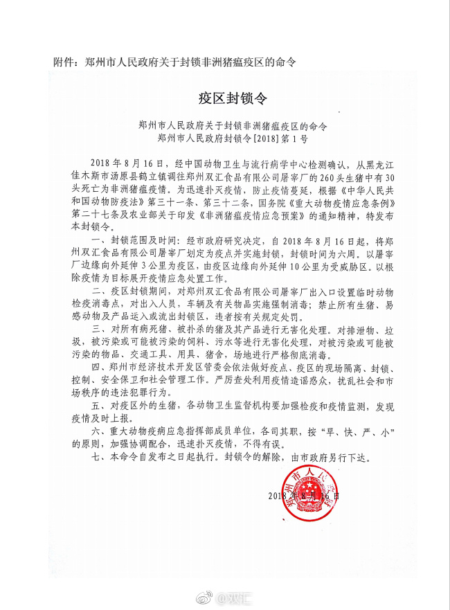 原标题:双汇回应郑州屠宰厂遭遇猪瘟事件:已扑杀1362头待宰生猪