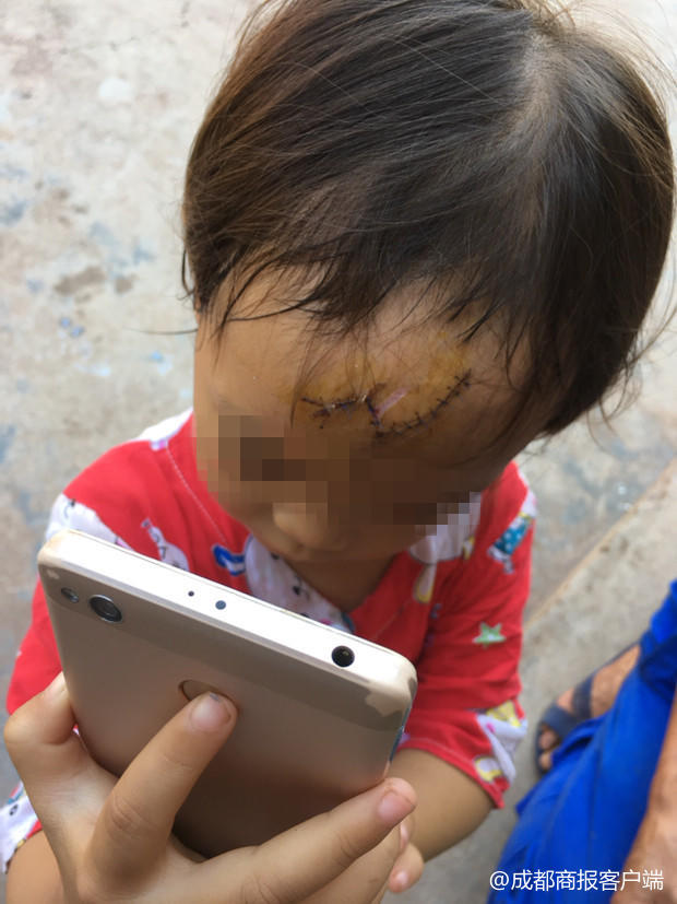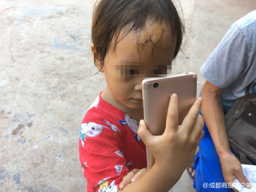 8月17号,小玉书出院,伤口没有拆线。8月19日上午,成都商报客户端记者赶到小玉书家,孩子正拿着父亲的手机给自己额头的伤疤拍照。事隔一周,小玉书仍清晰地记得被咬的场景,她指着门前的核桃树对记者说:“野狗在这里, 跑到家里来咬我。”
