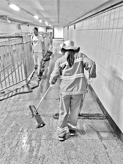 在A口通道的积水处,北青报记者看到,水源源不断地从地砖和墙砖的缝隙中渗出,不少地方的墙砖已经被染成了土黄色。B口通道的积水更为严重,在长约50米的地面上,紧挨着栏杆一侧放置了二十余个写着“防汛专用”的沙袋。即使如此,乘客仍不得不小心翼翼地踩着沙袋行走。