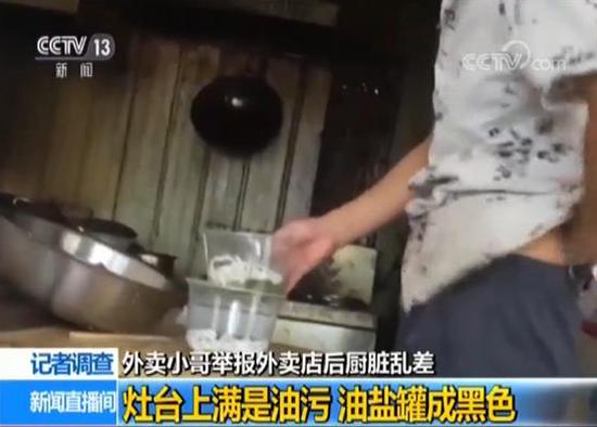 记者点了一份外卖,只见厨师一只手伸在后背挠痒,随后直接用这只手加工食物。放食物的桌子上苍蝇乱飞,灶台上面也满是油污,旁边的油盐罐也都变成了黑色。
