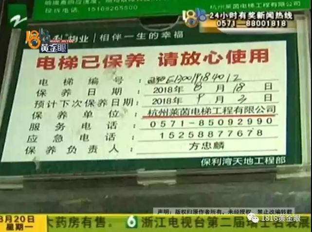 电梯厢体里,看到不到品牌标识,维保卡上的保养单位是“杭州莱茵电梯工程有限公司”,下次保养日期是9月3号。记者联系上应急联系负责人周先生。