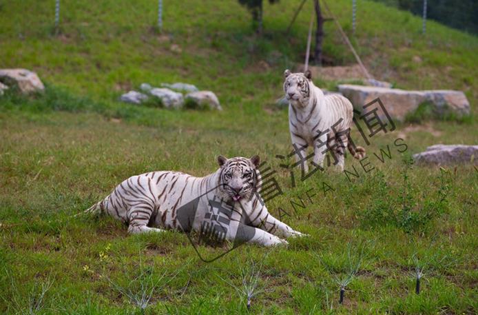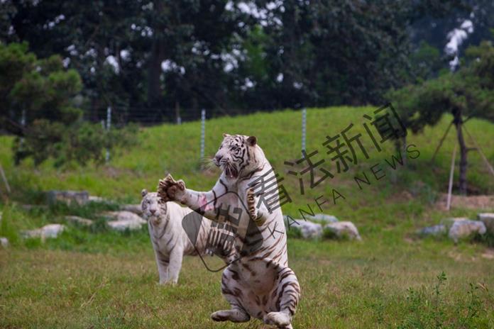 法制晚报·看法新闻(记者 李东)李伴着溪水淙淙,两只大白老虎悠闲地散着步,三只小白老虎在水间嬉戏。他们是“一家五口”,今天第一次集体亮相接受游客游览。