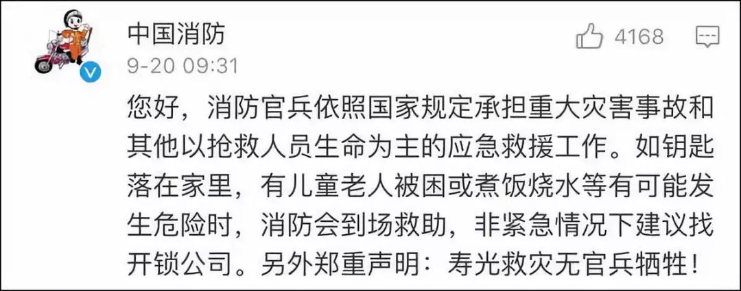 @中国消防先是精简凝练地介绍了消防官兵的主要职责所在,再补充解释如果有钥匙落在家里,并且家中有儿童老人被困或其他紧急危险情况时,消防力量才会出警救助。