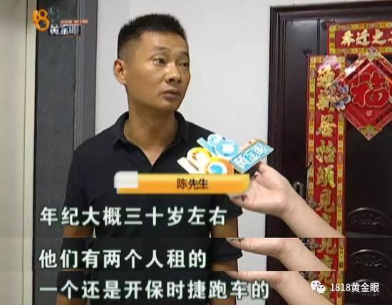 陈先生:“年纪大概三十岁左右,他们有两个人租的,一个还是开保时捷跑车的,他们那边白天基本上没人的,晚上很晚才回来,不知道做什么的,我们也不清楚。”