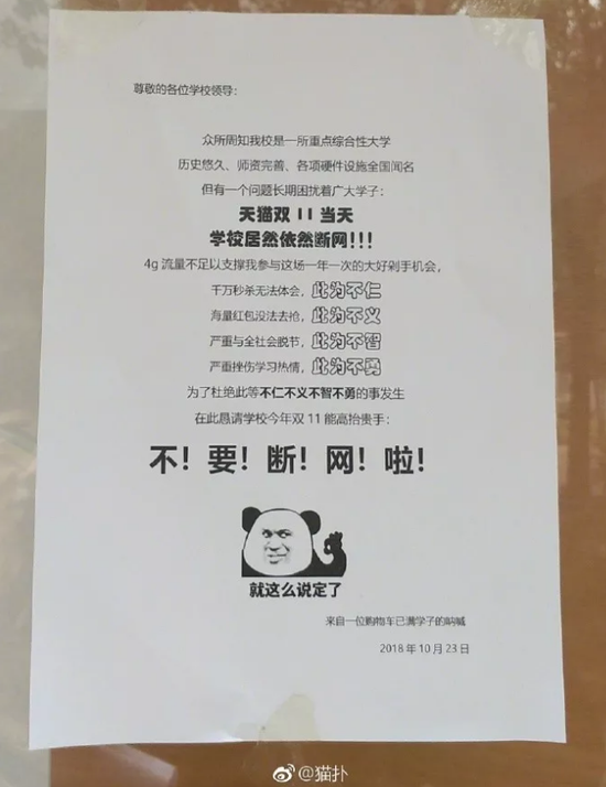 在这封署名为“来自一位购物车已满学子的呐喊”请求信中,作者表示,4G流量不足以支撑他参与这一年一次的大好剁手机会,恳请学校能高抬贵手,不要断网了……