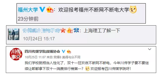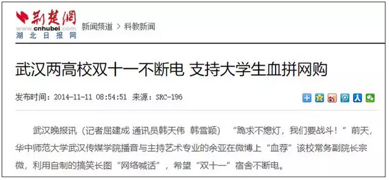 早在2014年,华中师范大学武汉传媒学院播音与主持艺术专业的余亚在微博上“血荐”该校常务副院长宗微,利用自制的搞笑长图“网络喊话”,希望“双十一”宿舍不断电。