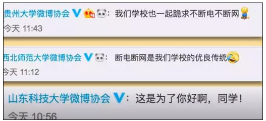 该校常务副院长宗微便在微博中评论道“血荐,过于生猛了吧。”随后,该校广播台便在微博上又开启了“双十一狂欢,不!断!电!”的投票版块,对“我要遵守《双十一协定》,支持不断电!”和“我要做一个高冷的睡美人,不支持!”进行投票。结果参与投票的400余名学生中,“赞同不断电”的学生高达90%。