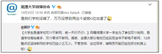 湘潭大学网络与信息管理中心的老师表示:按照正常的情况,学校规定12点正式断网,没有任何通知(双11)作为一个特殊的情况不断网。