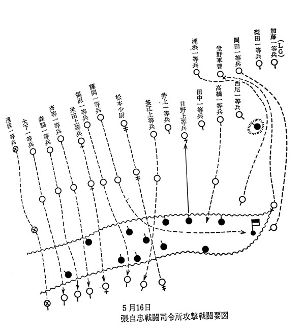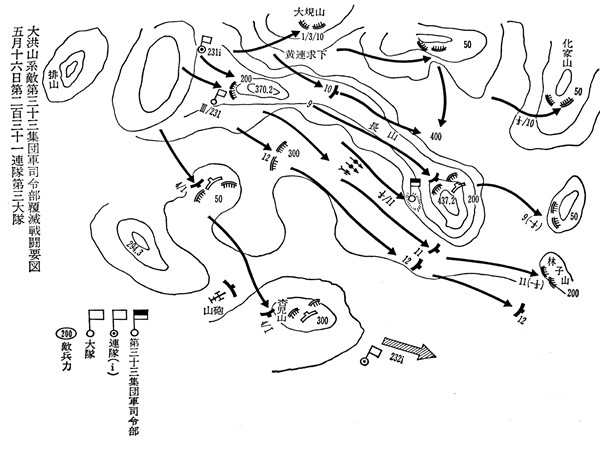 日军战史中步兵第231联队第3大队对张自忠战斗司令部攻击经过图(注:该图上方为南方)