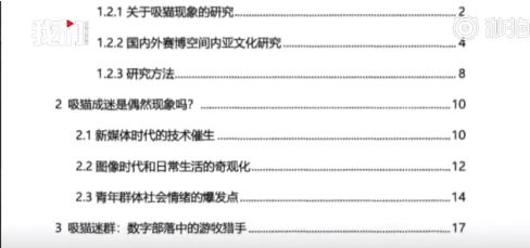 王同学的论文题为“乌有之猫:”云吸猫“迷群的认同与幻想”,据文汇报报道,这篇论文共有62页,主要分为绪论,“吸猫成迷是偶然现象吗? “”吸猫迷群:数字部落中的游牧猎手“”乌托邦神话的生产者和消费者“”吸猫迷群的身份认同“等章节。