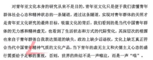 论文的结论中提到,吸猫文化的背后是当代中国青年群体的无力感和精神虚无,是文化上缺乏真正符合当代中国青年精神气质的文化产品。并提醒道,这种虚无主义和犬儒主义心态的盛行需要给予足够的重视,否则,世界的终结不是一声啜泣,而是一声“喵”。