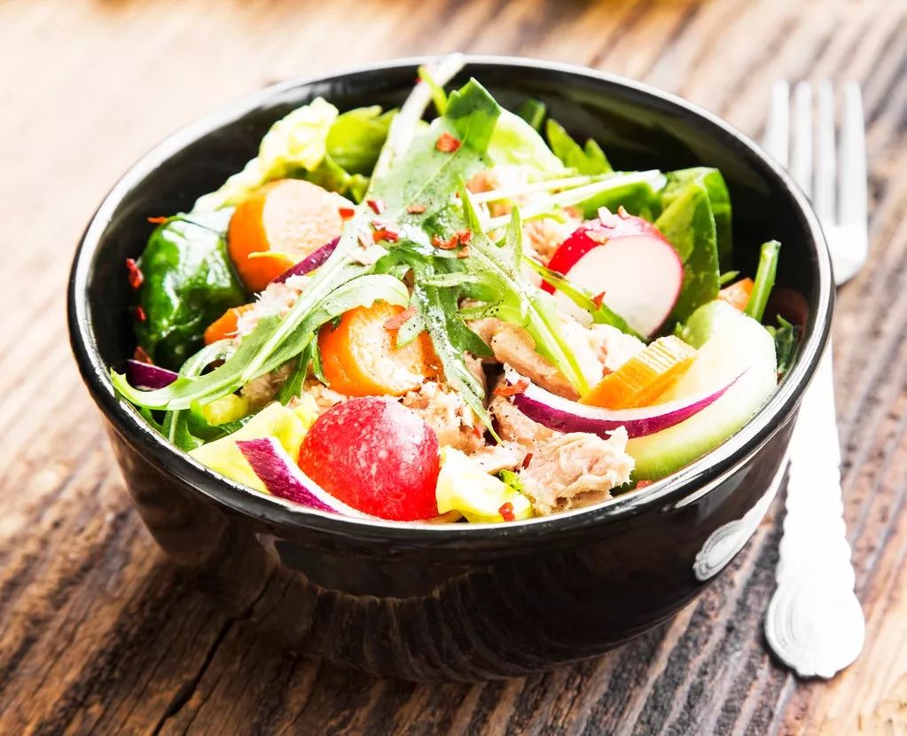 盆内放上混合生菜,番茄块,小红萝卜片,洋葱圈和彩椒丝,撒上金枪鱼肉(罐头),淋入油醋汁即可。