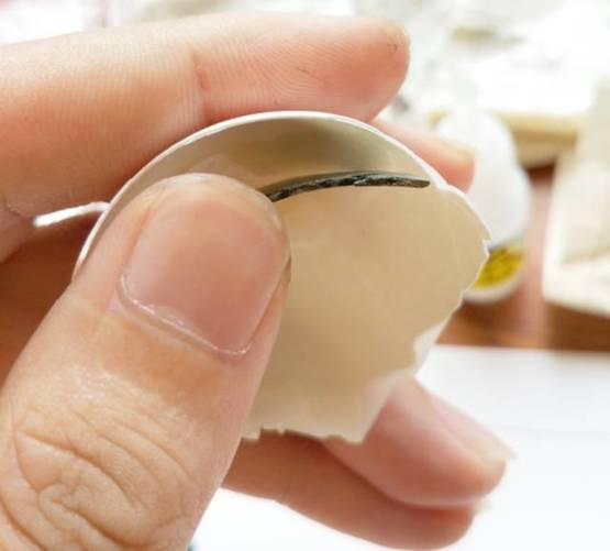 实际的鸡蛋壳比较起来,蛋壳陶还是略厚的,大致相当于两到三个鸡蛋壳的厚度(我选的是白皮蛋壳,红皮蛋壳可能比白皮蛋壳要厚些;如果选红皮蛋壳的话,相当于两个蛋壳厚度差不多)。