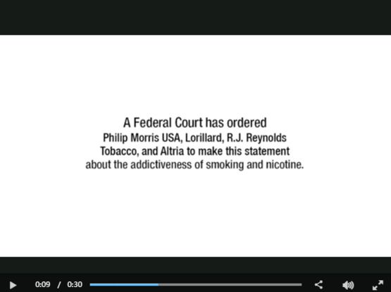 按照法庭裁决,从2017年11月26日至2018年3月4日,美国排名前三的烟草公司阿尔特里亚集团(Altria)、雷诺兹(R.J. Reynolds Tobacco)和洛里拉德(Lorillard)将在美国50多家报纸发布整版广告,分别在5个周日刊登,每次涉及一个类别的声明公告。与此同时,法庭还要求上述烟草公司在主流电视频道晚上7点至10点的黄金时段播出更正声明,为时一年。另外,这些声明还将出现在烟草公司自家网站及其烟草产品的外包装上。