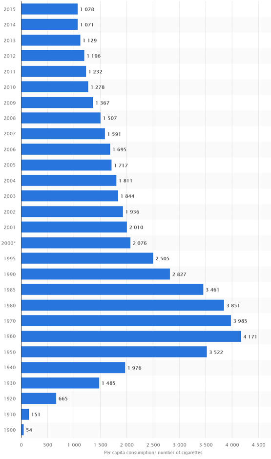 无论如何,经由半个多世纪的持续控烟,美国人均烟草消费量已降至2015年的1078支。相形之下,想想中国的控烟状况,可谓没有比较就没有伤害。在中国年轻人中,将近2/3的男性和8%的女性有吸烟的习惯。世界上每3支卷烟中就有1支被中国人消费,每天约有3000人因为吸烟致死[2]。在中国,控烟之路依然任重道远。(编辑:odette)